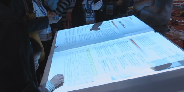 通過(guò)兩個(gè)按鈕,觀(guān)眾可以選擇書(shū)的內容,書(shū)的內容即時(shí)通過(guò)投影機投射出來(lái);